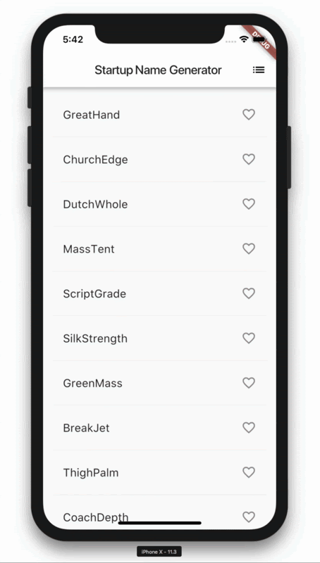 スタートアップの会社名の提案リストを生成するシンプルなアプリを作成します。ユーザーは名前を選択したり洗濯を解除することができ、ベストなものをひとつ保存できます。コードは一度に10種類の名前を遅延生成します。ユーザーがスクロールすると追加の名前が生成されます。ユーザーがどれだけスクロールしても制限はありません。