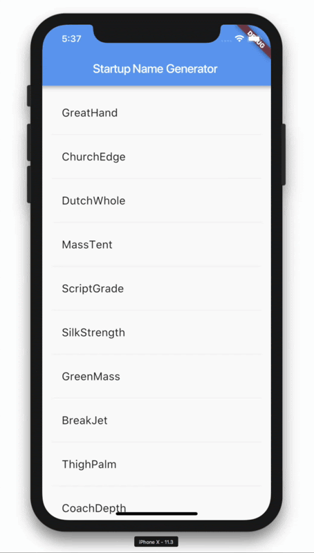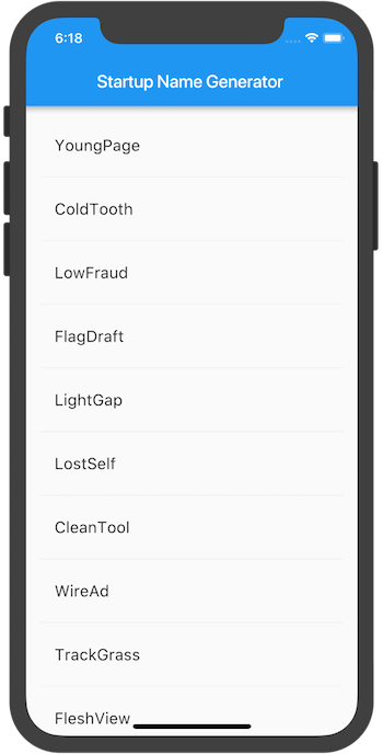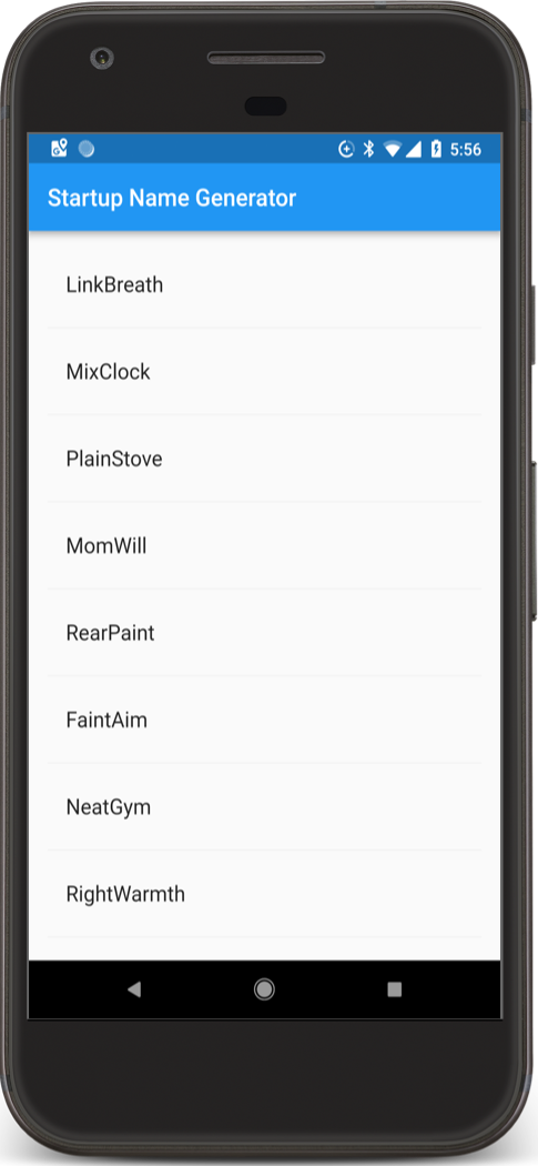 このステップでは単語のペアのリストを生成して表示するように_RandomWordsStateを拡張します。ユーザーがスクロールすると、リスト(ListViewウィジェットに表示されている)は無限に増えていきます。ListViewのbuilderファクトリーコンストラクターは必要に応じてリストビューを遅延生成することができるようになっています。
